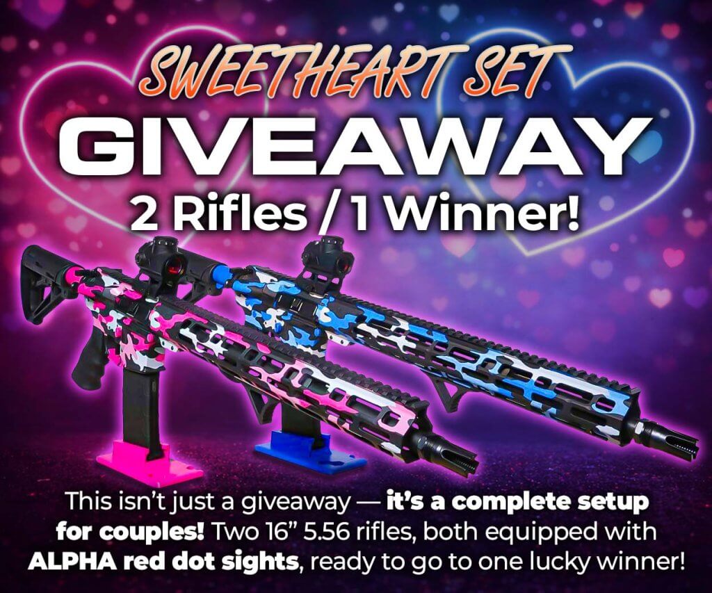 The Ultimate Match Made in Lead. Win the “Sweetheart Set”—two 16” 5.56 rifles in custom Cerakote Camo, both topped with AT3 ALPHA Red Dot Sight. Perfect for you and your favorite shooting partner. One winner. Two rifles. Increase your odds by having your partner sign up too!